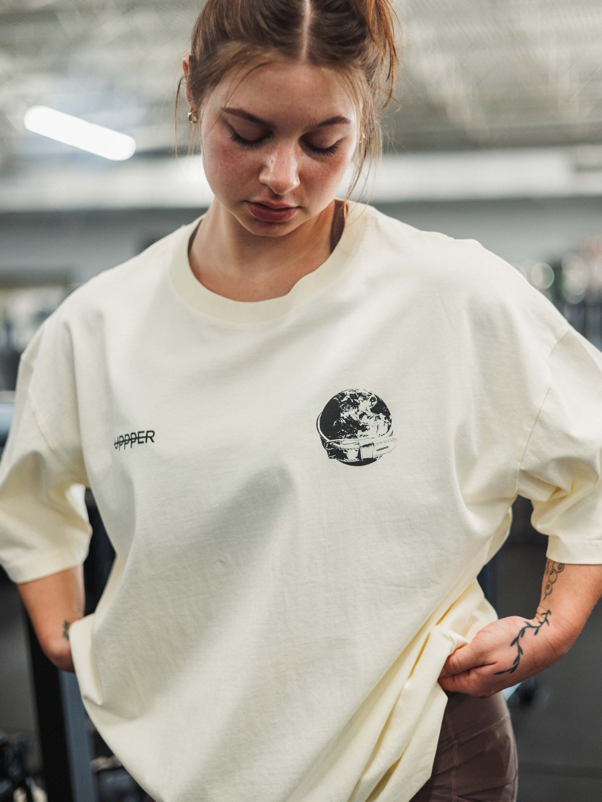 Embrace the power of purpose with UPPPER's Lifting The World T-Shirt. This creamed-colored t-shirt features a striking black print on the back, showcasing the iconic UPPPER Belt around the world—a symbol of strength, resilience, and unyielding determination.